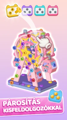 A játékmenet magával ragadó és intuitív. Szabadon forgathatja a részletgazdag 3D modelleket, hogy minden szögből megvizsgálja azokat, és felfedezze a rejtett összefüggéseket. Feladata lesz a csavarok kioldása a mélyen rögzült anyákból, miközben elkerüli a beakadt elemeket, amelyek gátolhatják a haladását. Használja okosan a rendelkezésre álló üres lyukakat, hogy helyet csináljon a kiszabadítandó csavaroknak, majd válogassa szét őket a színkódolt rekeszekbe. Az elakadt pillanatokban hasznos kellékek állnak rendelkezésére: kalapáccsal törhet üveget vagy akadályokat, fúróval új lyukakat készíthet, seprűvel pedig eltávolíthatja a felesleges furatokat. Gyűjtsön különleges tárgyakat és csavarhúzókat, hogy meglepetésjutalmakat és izgalmas eredményeket szerezzen.