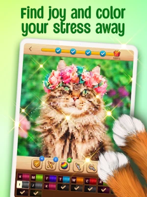 Merüljön el a színek és formák végtelen sokféleségében, miközben a **Cross-Stitch: Coloring Book** kényelmes és felhasználóbarát játékmenetével kikapcsolódik. A nyugtató zenei aláfestés tökéletes hátteret biztosít ahhoz, hogy elmerüljön a mandalák, édességek, természeti képek, állatok, virágok és számos más stílusú minták tucatjaiban, melyek naponta frissülnek. Különleges ünnepi témákkal is készülünk, a karácsonytól a Valentin-napon át a húsvétig, így minden alkalomra talál valami különlegeset. Emellett a kreativitás szabadon szárnyalhat, hiszen bármilyen fotót feltölthet a galériájából, és a **Cross-Stitch: Coloring Book** azonnal keresztszemes mintává alakítja, hogy Ön életre kelthesse kedvenc képeit.