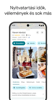 Készüljön fel minden utazásra alaposan és kényelmesen. Az Utcakép funkcióval előre megismerheti a célkörnyezetet, ellenőrizheti a parkolóhelyeket és a bejáratokat, még mielőtt elindulna. A lenyűgöző 3D-s madártávlati nézet, a Berepülő nézet, lehetővé teszi, hogy felmérje a nevezetességeket, parkokat és útvonalakat, sőt még az aktuális időjárást is megnézheti, hogy felkészülhessen. Rendezze személyes listákba kedvenc elmentett helyeit, és ossza meg azokat könnyedén barátaival. Rendeljen ételt házhoz, vagy vegye át elvitelre, foglaljon asztalt étteremben vagy szállást egy gombnyomással. Az offline térképek biztosítják, hogy soha ne tévedjen el, még a gyenge térerővel rendelkező területeken sem. Fedezze fel a környező látnivalókat, böngésszen felhasználói vélemények és fotók között a megalapozott döntésekhez.