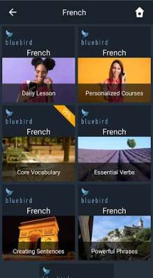 A Kékmadár célja, hogy a francia nyelv minden aspektusát alaposan elsajátítsa. Képes lesz megérteni és használni 2000 leggyakoribb szót, amelyek a mindennapi beszélgetések 84%-át alkotják. Megtanulhatja a 100 legfontosabb igét, azok múlt, jelen és jövő idejű ragozásával együtt, és magabiztosan alkothat teljes mondatokat. Szerezzen gyakorlatot tucatnyi mindennapi szituáció kezelésében, és fejlessze képességét, hogy összetett beszélgetéseket is sikeresen vezessen. A tanultak megerősítésére több mint 2000 vetélkedő áll rendelkezésre, amelyek kártyák és változatos kérdéstípusok (hallás, olvasás, írás) segítségével tesztelik és elmélyítik tudását. Ráadásul bármikor nyomon követheti fejlődését az órákról és kvízekről készített részletes statisztikák révén, a leckéket pedig akár okoshangszóróra vagy tévére is streamelheti.